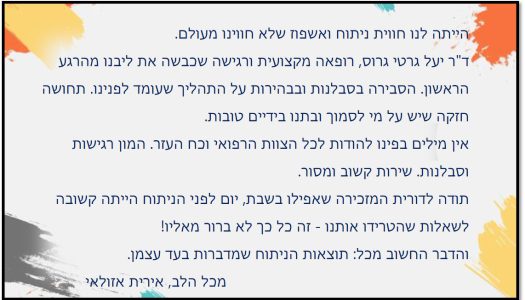 ד"ר יעל גרטי גרוס ודורית – תודה על המקצועיות והרגישות – ממש לא מובן מאליו!