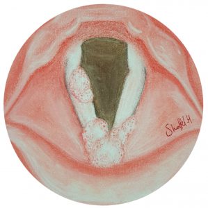 באיור: פפילומה במיתרי הקול, לפני טיפול