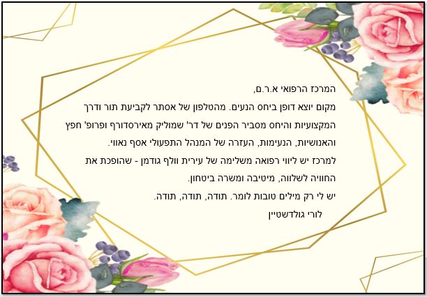 דף הבית | ד"ר שמוליק מאירסדורף, פרופ' חפץ, עירית ואסף היקרים – תודה על המקצועיות והאנושיות שבטיפולכם!