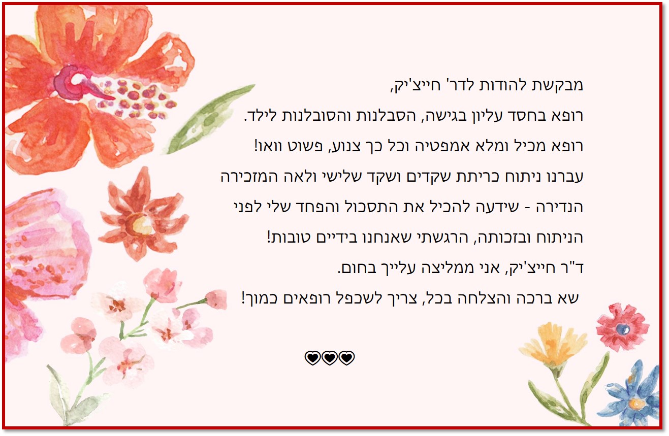 דף הבית | תודה רבה לד"ר חייצ'יק – רופא בחסד עליון וללאה המתאמת – שהינה נדירה ברגישותה